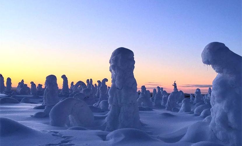 Eine Schlittenfahrt mit dem Schneemobil führt Sie durch das Winterwunderland des Fjälls Kuntivaara, in herrliche Landschaften voller schneebedeckter Bäume, in die Wildnis von Kuusamo.